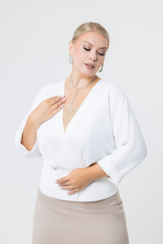 Блуза прямого силуэта выполнена из плательного крепа. V- образный вырез горловины. Рукав цельнокро еный, на манжете. Длина 3/4. Застёжка на пуговицы.