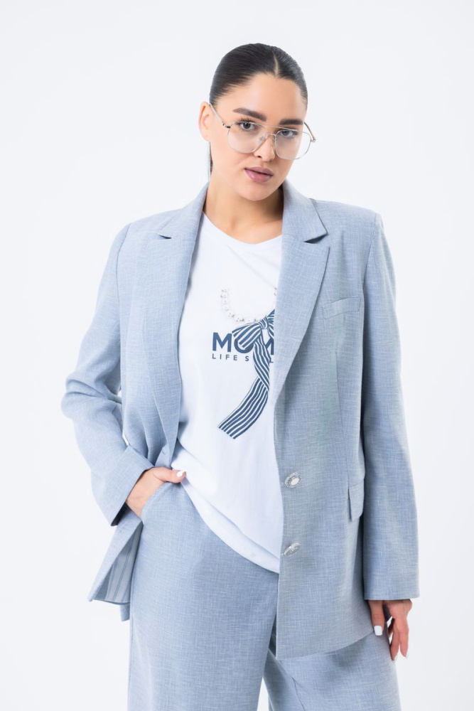 Модель прямого силуэта выполнена из костюмной ткани. Воротник пиджачного типа. Рукав втачной, длинный. По полочке два действующих кармана. По спинке вставка из хлопковой ткани.