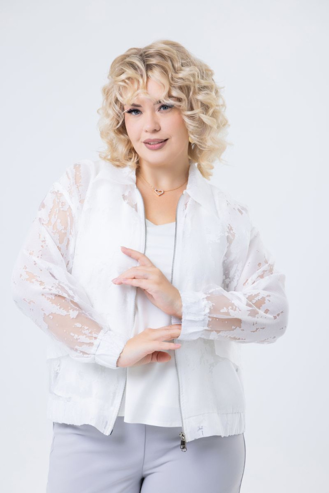 Модель прямого силуэта выполнена из полупрозрачной органзы. Отложной воротник. Спущенная линия плеча. Рукав длинный. По полочке клапаны и застёжка на молнию.