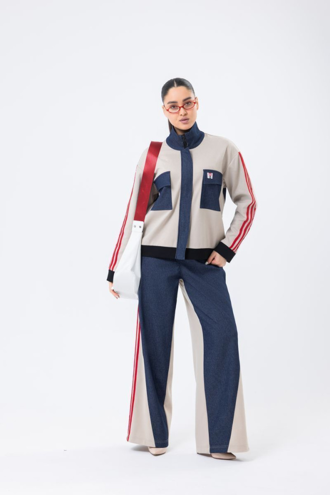 Модель прямого силуэта выполнена из джинсы и трикотажа. Отложной воротник. Рукав втачной. По центру рукавов декоративная тесьма. Застёжка на молнию.
