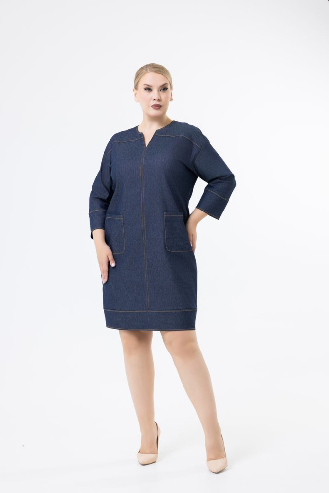 Платье прямого силуэта выполнено из джинсовой ткани. Круглый вырез горловины с V-образным вырезом. Спущенная линия плеча. Рукав ¾. Имеются два действующих кармана.