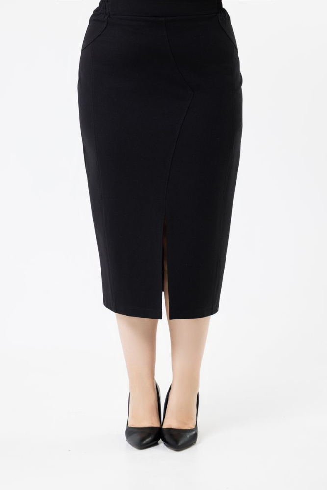 Изделие выполнено из трикотажного полотна. Пояс фиксированный, по бокам на резинке. По полочке отстрочки и разрез.